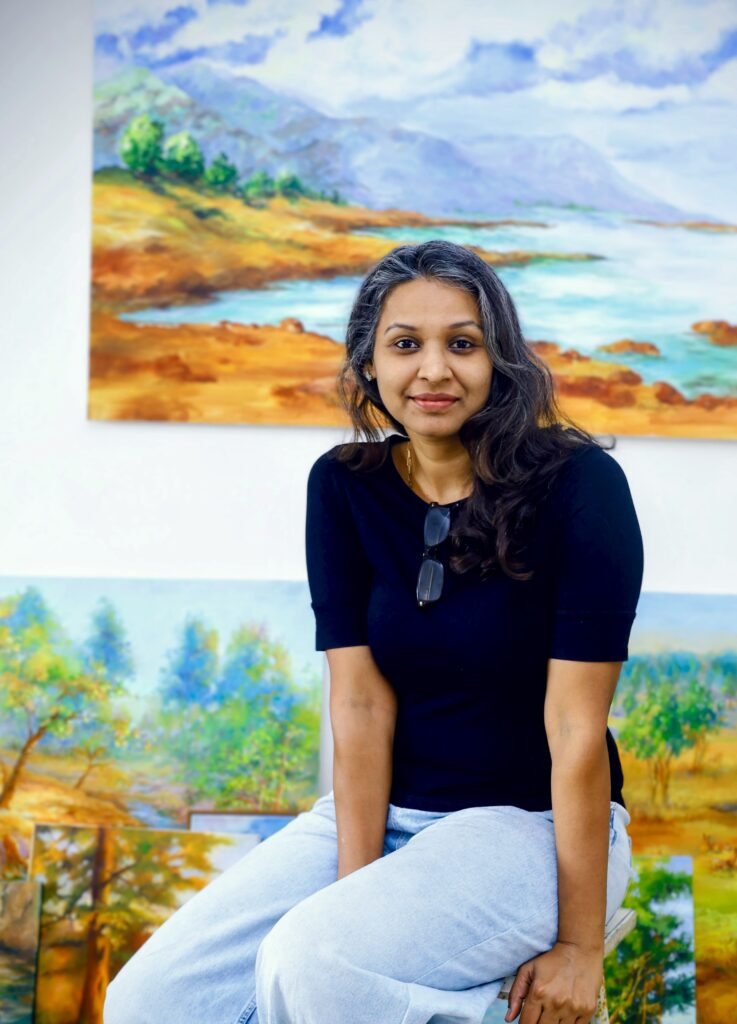 Vasundhara is a Mumbai based, Indian artist who was a banker before she quit to create more space for art in her life. Art for her is invoking optimism and brighter perspective about life through inspiration from nature. Through her art, she represents the serenity and peace to the viewer. She likes to explore various mediums. Her preferred ones being Oils, Watercolours Charcoal and Inks. Academically, she has studied Engineering and is MBA from Mumbai University. Although mostly self-taught, she has been trained by masters like Mohan Jadhav (Pune) and Ricky Mujica (New York). She has exhibited her works in India, Dubai, Italy, Texas and San Diego. Some of her Dubai cityscapes were featured by Arte & Lusso magazine in 2021. She has also collaborated with international artist in some interesting art projects. Her art is a tribute to the beauty of nature, an invitation to pause and reflect on it’s wonders that often go unnoticed. Through her works, she aims to build a deeper connection with the environment, more so in today’s times, encouraging viewers to appreciate and cherish nature for years to come.